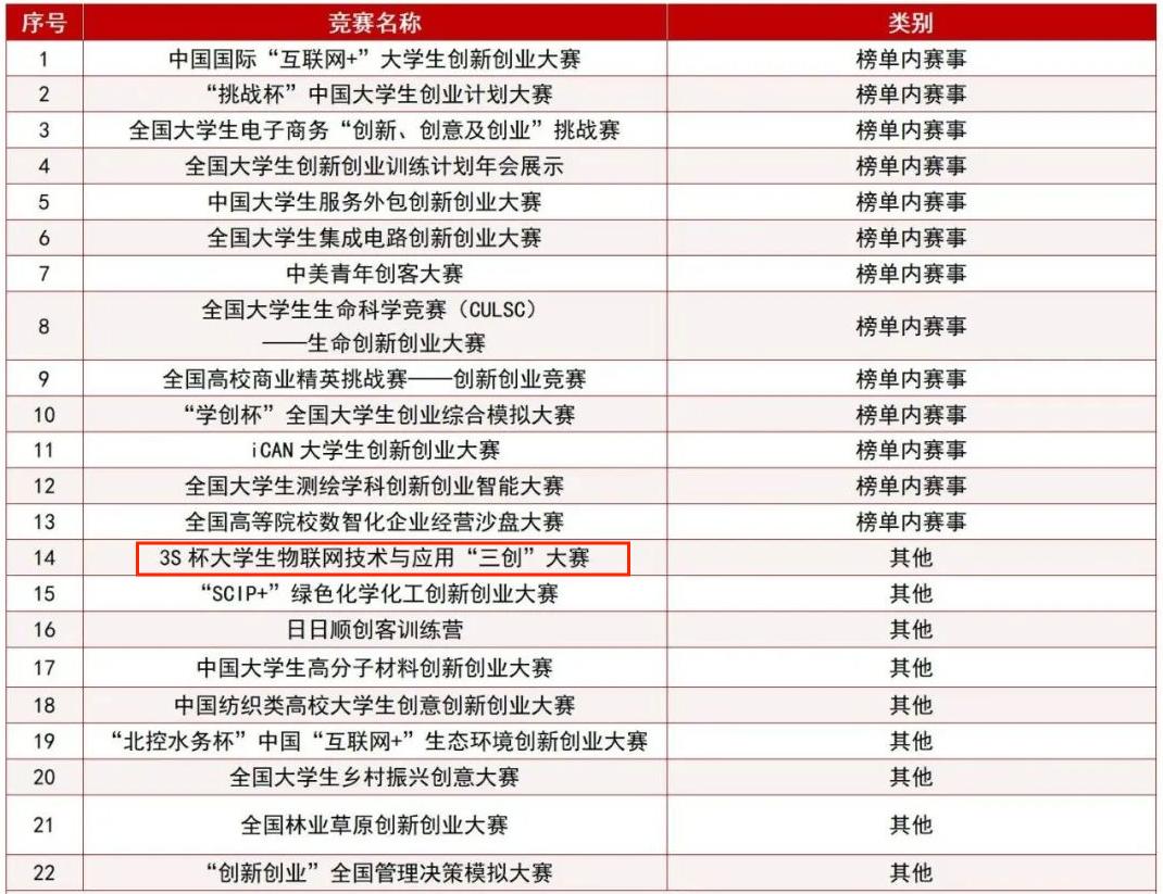 热烈祝贺3S杯大学生物联网技术与应用“三创”大赛纳入创新创业类竞赛研究报告竞赛项目名单